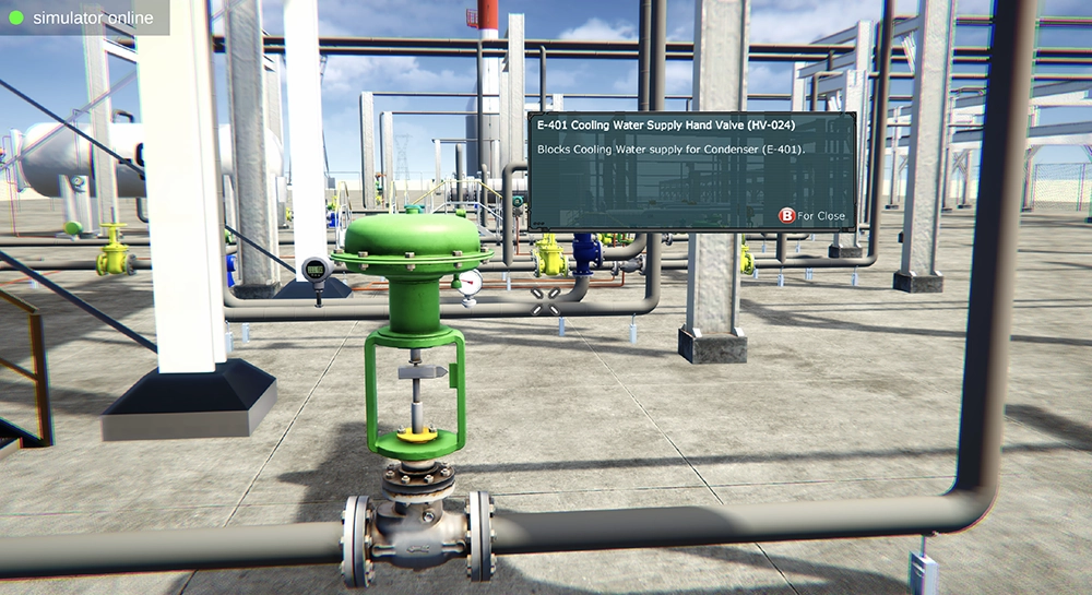 VFO 2.0 – A new dimension in training.The VFO 2.0 is an interactive 3D virtual training environment that enables the learner to better understand and visualize the real world operating environment. VFO expands the training opportunities to include the field operator’s roles and responsibilities. Learners can navigate through virtual units, tracing flows and locating equipment. Learners use local gauges and panels to observe actual operating conditions, start/stop pumps, and open/close valves to interact with the process.