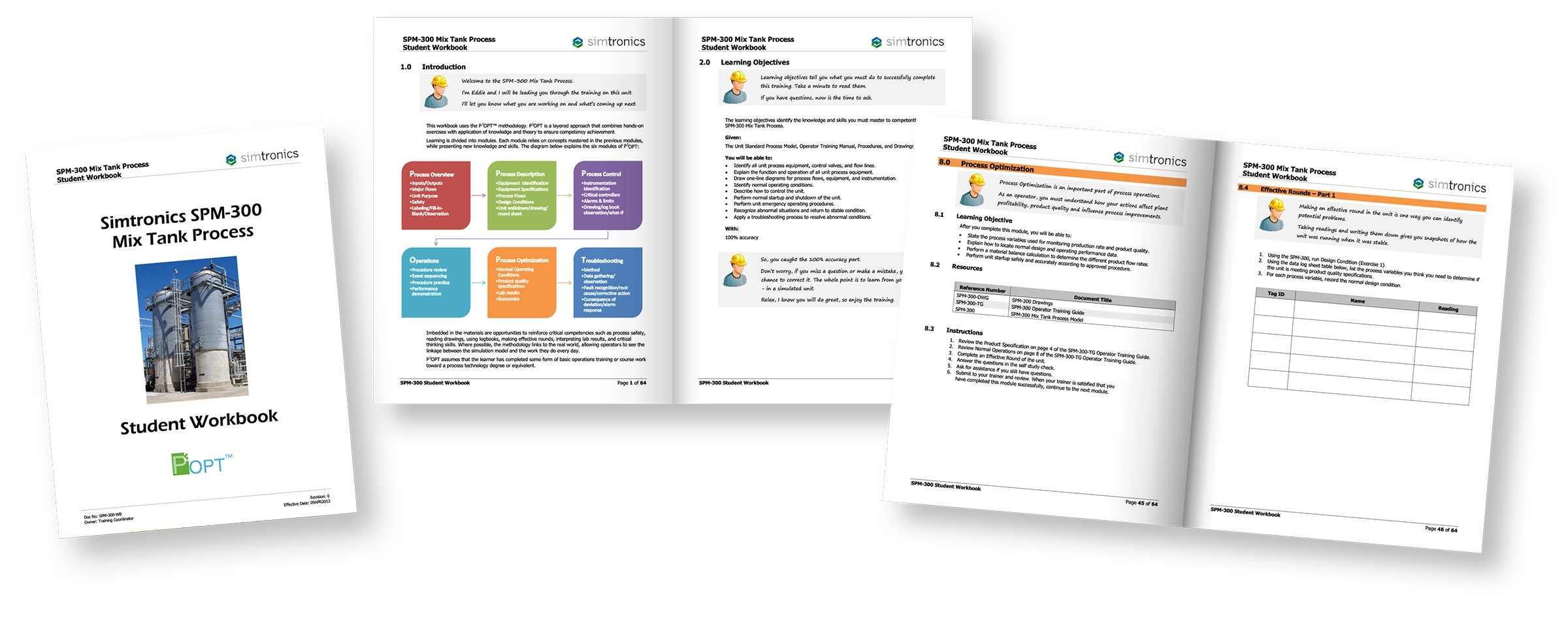 These workbooks use the P3OPT methodology, which is a layered approach that combines hands-on exercises with application of knowledge and theory to ensure competency achievement. Learning is divided into modules, so you have the flexibility to tailor your program and integrate simulation into your existing operator training. Each module relies on concepts mastered in the previous modules, while presenting new knowledge and skills.